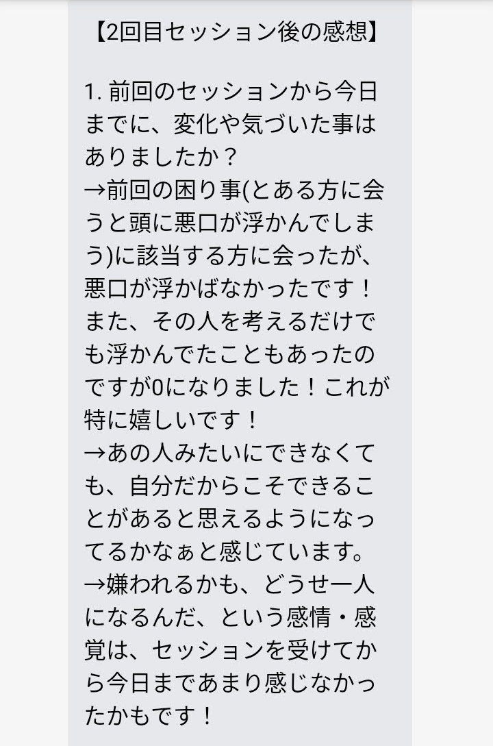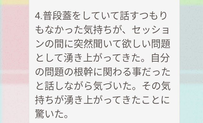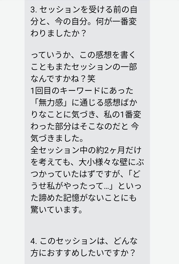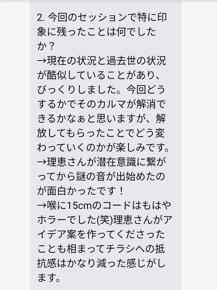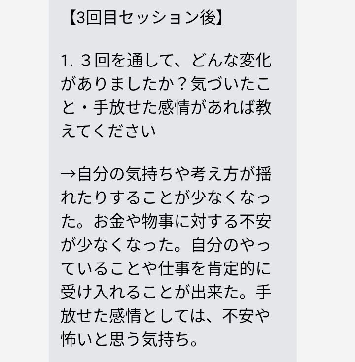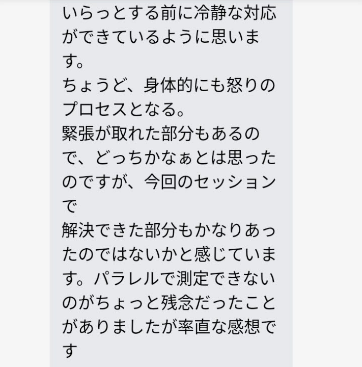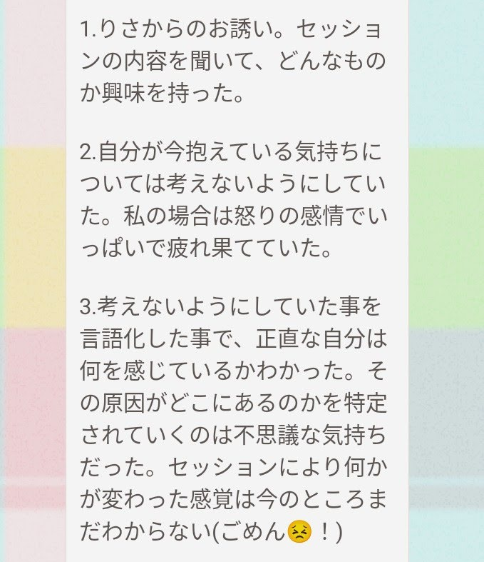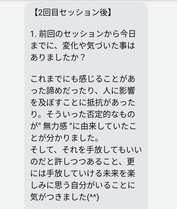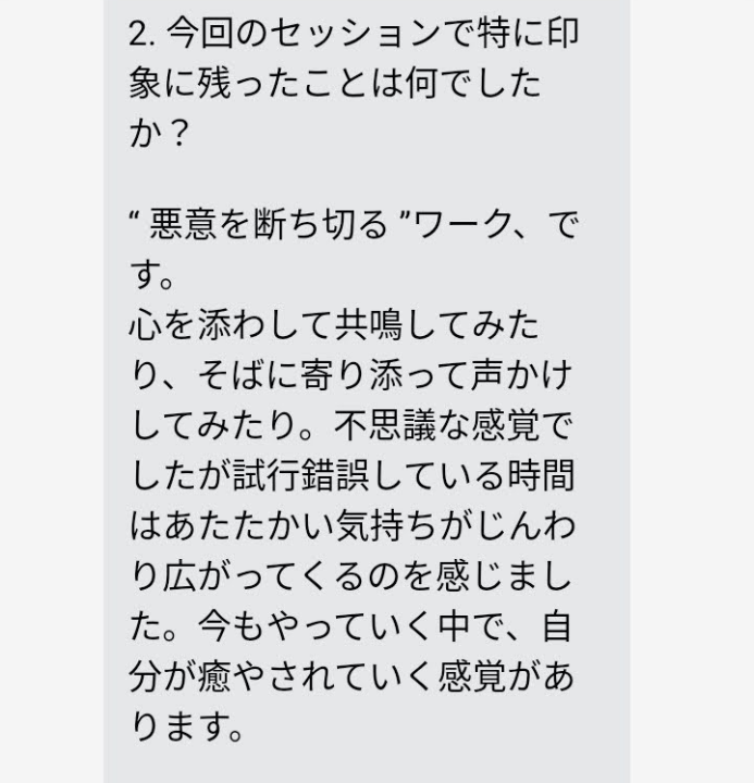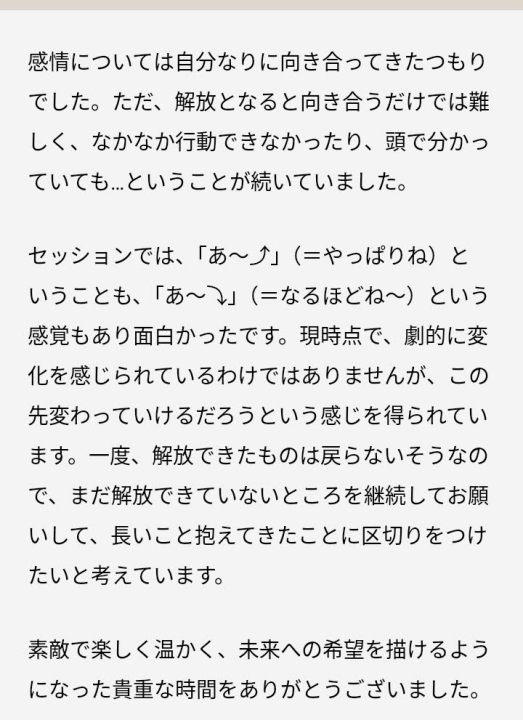 セッションでは、「あ~⤴」(=やっぱりね)ということも、「あ~⤵」(=なるほどね~)という感覚もあり面白かったです。現時点で、劇的に変化を感じられているわけではありませんが、この先変わっていけるだろうという感じを得られています。