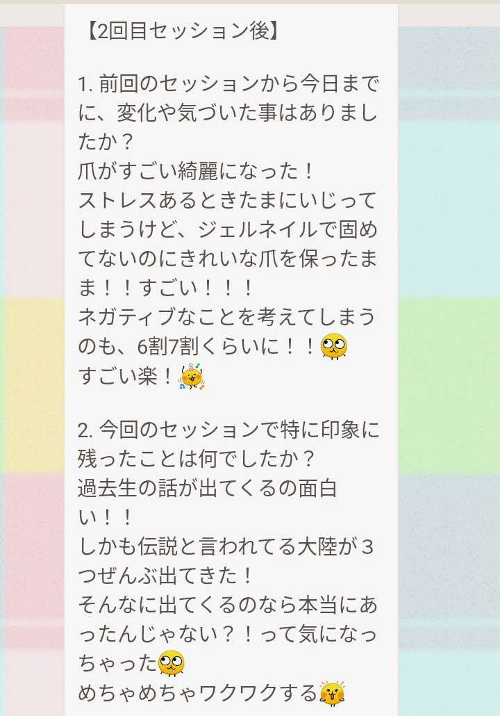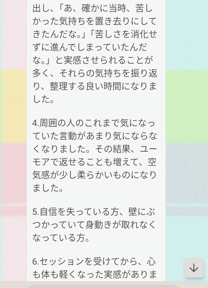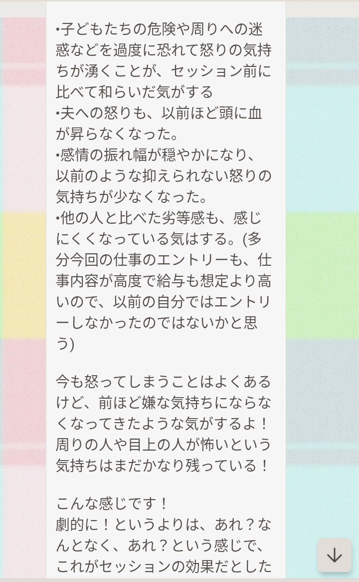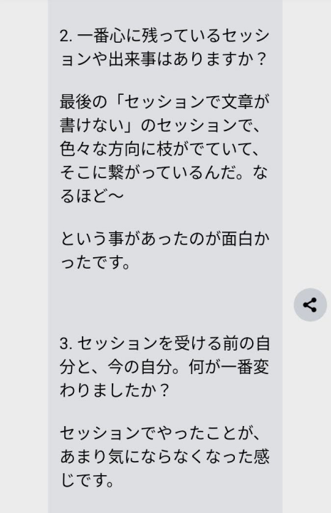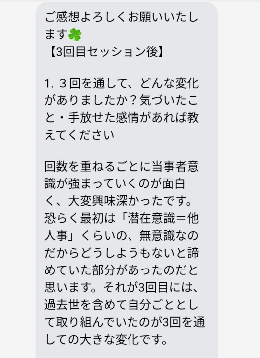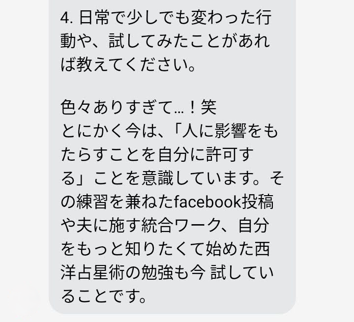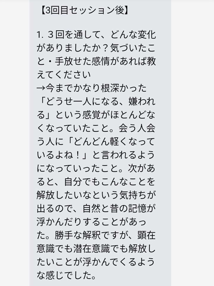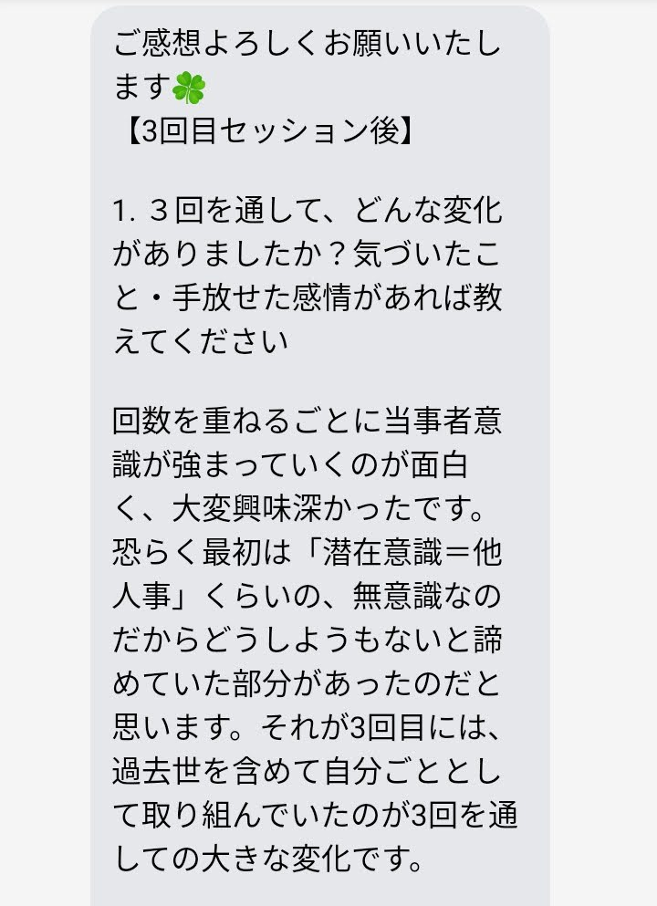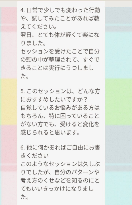 セッションでは、「あ~⤴」(=やっぱりね)ということも、「あ~⤵」(=なるほどね~)という感覚もあり面白かったです。現時点で、劇的に変化を感じられているわけではありませんが、この先変わっていけるだろうという感じを得られています。