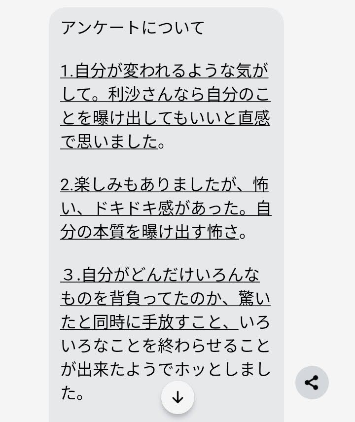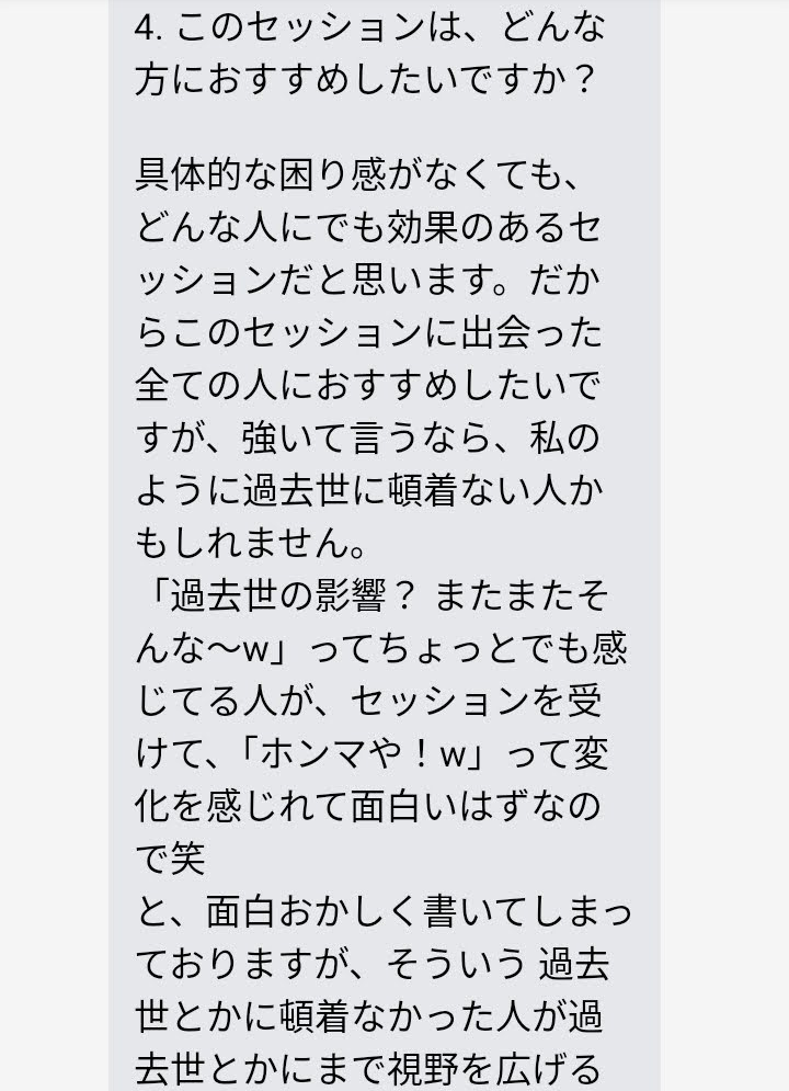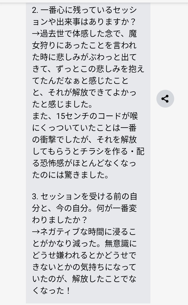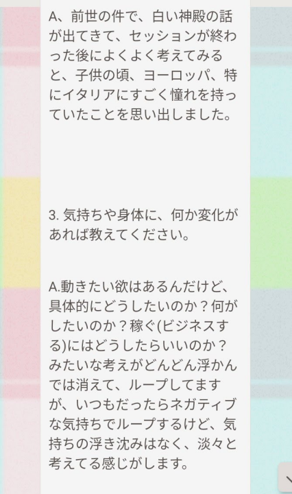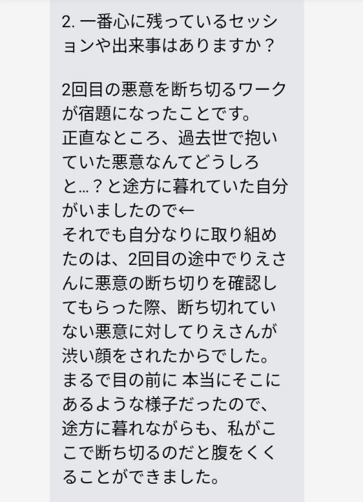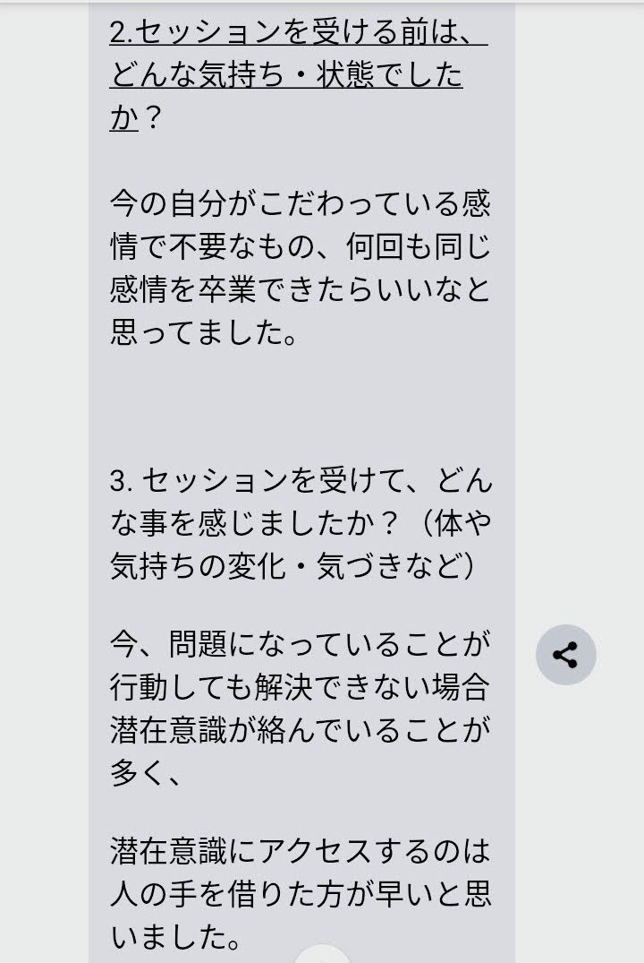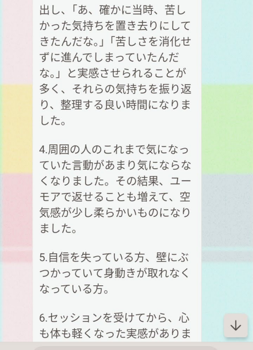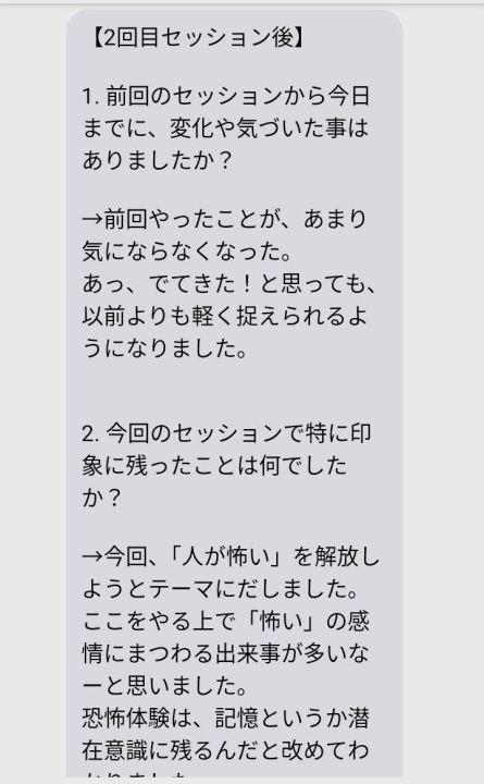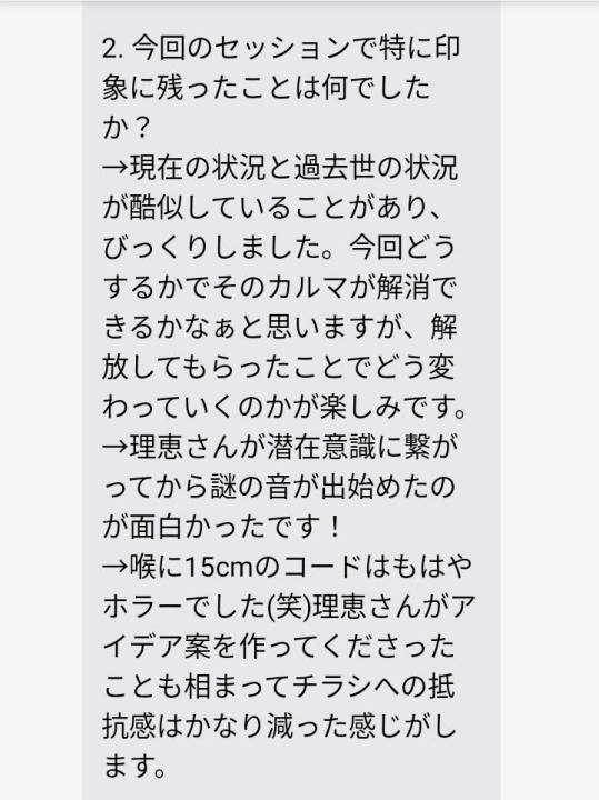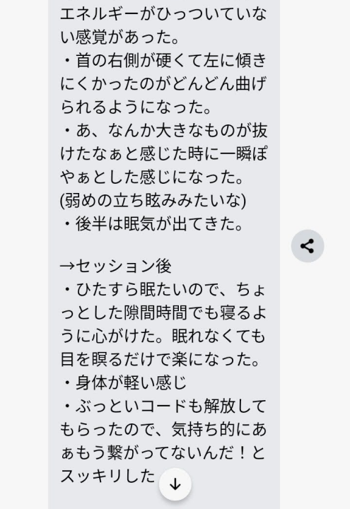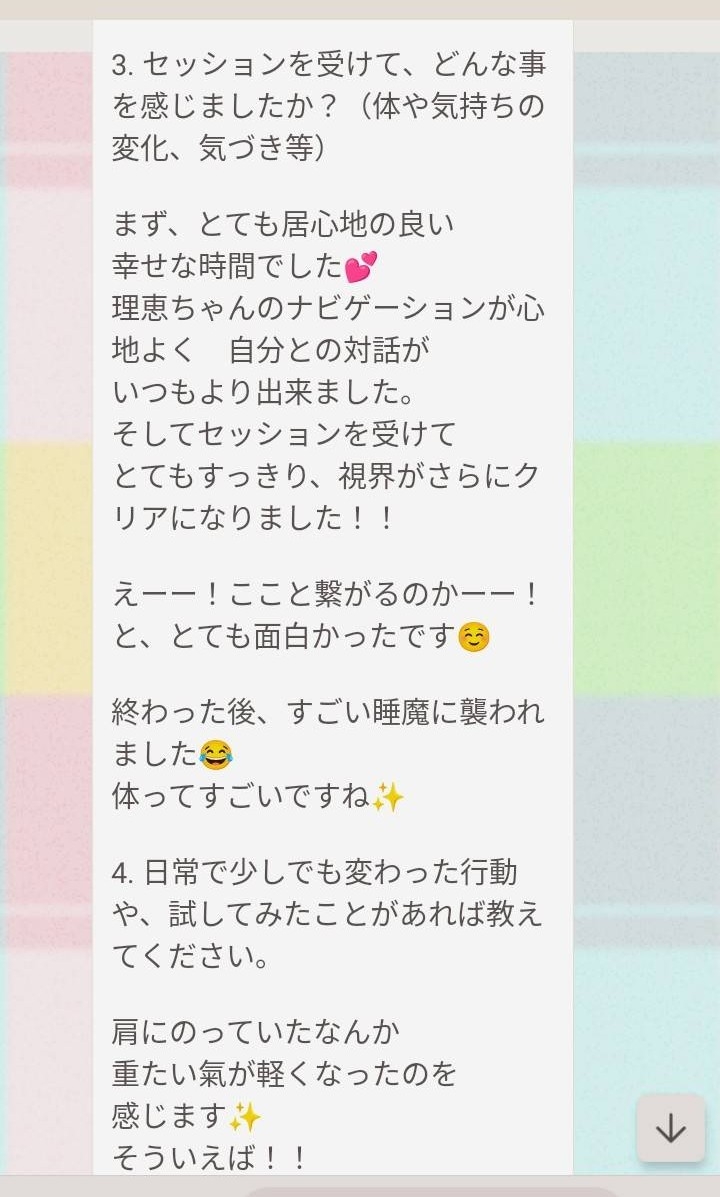 セッションでは、「あ~⤴」(=やっぱりね)ということも、「あ~⤵」(=なるほどね~)という感覚もあり面白かったです。現時点で、劇的に変化を感じられているわけではありませんが、この先変わっていけるだろうという感じを得られています。