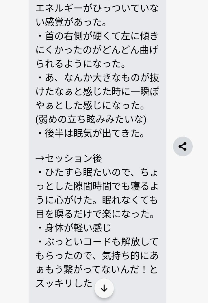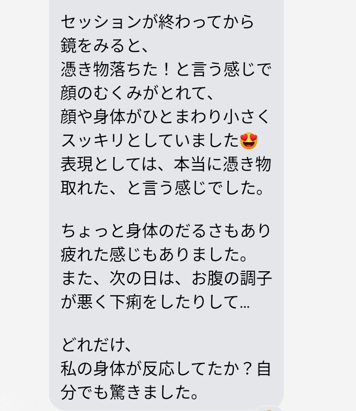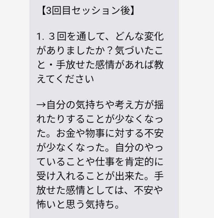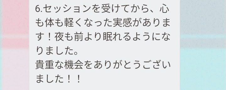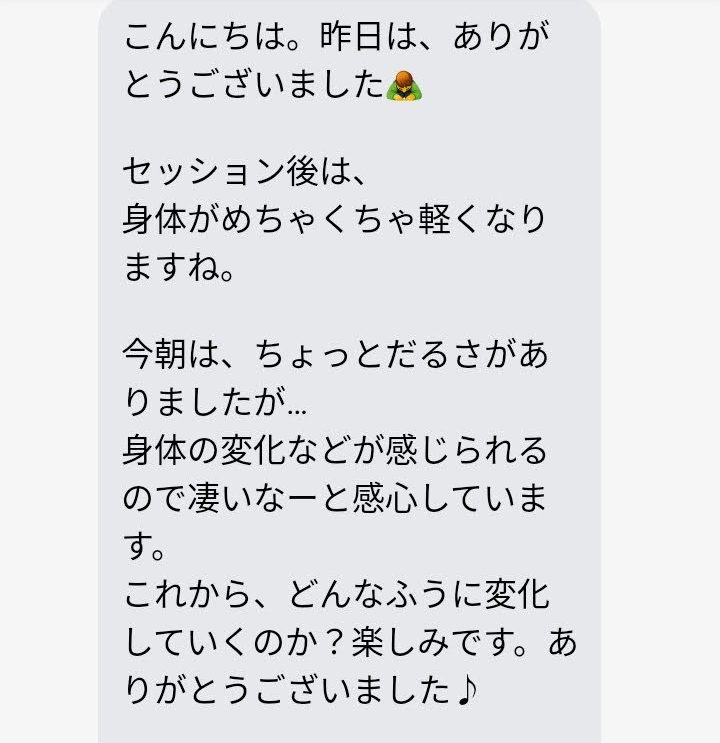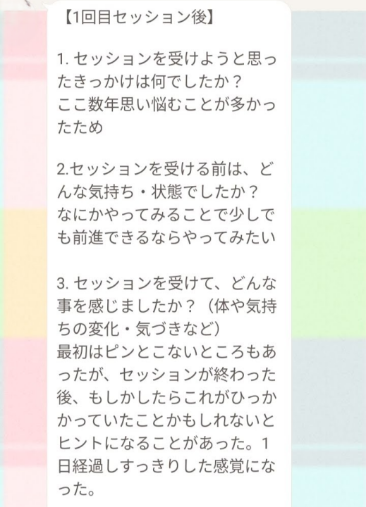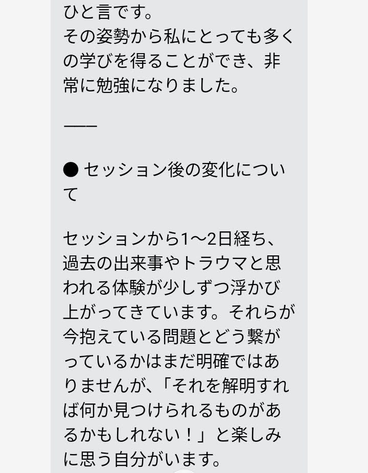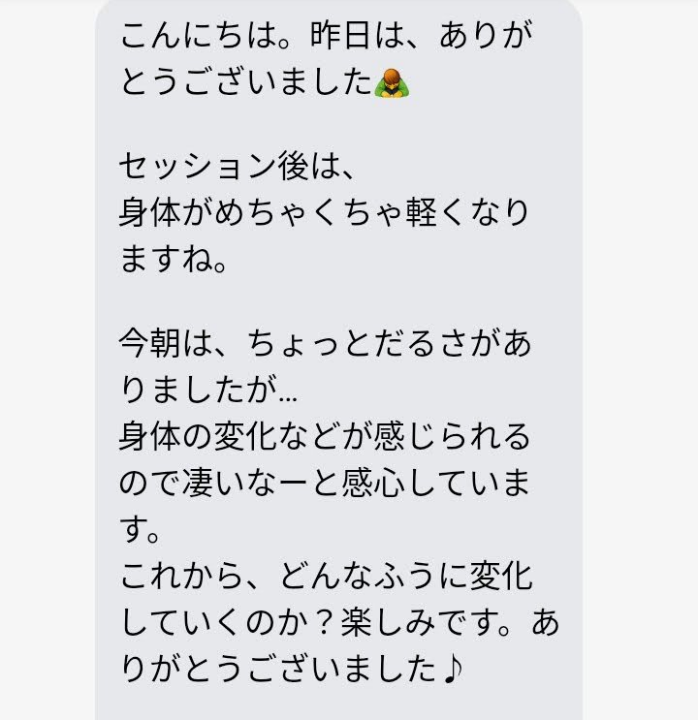 瞑想が苦手で誘導してもらってもなかなかイメージができずにいましたが、セッションを受けた後に行った瞑想ではスムーズにそのイメージができる感覚がありました。