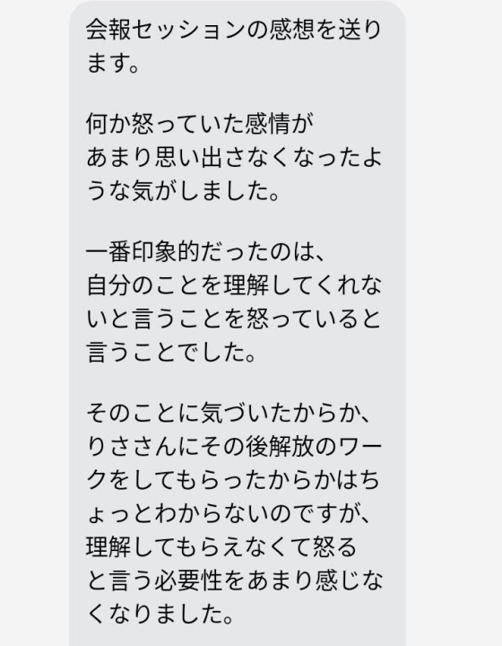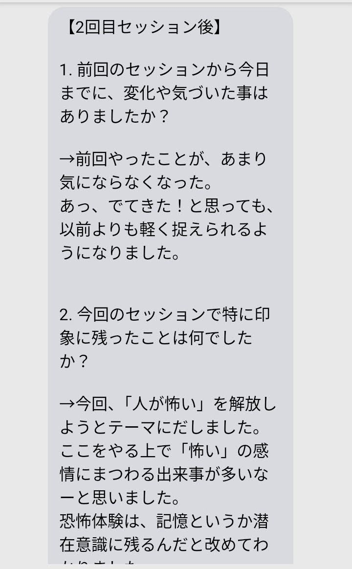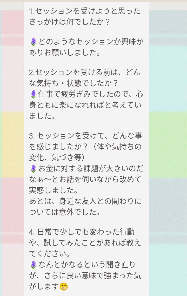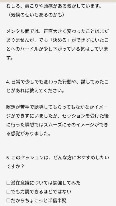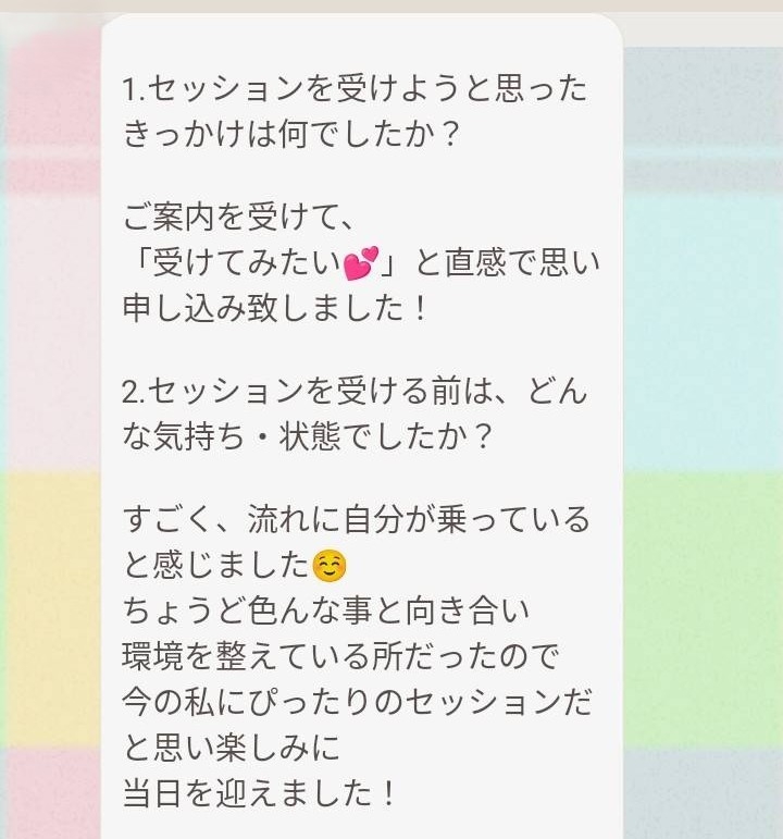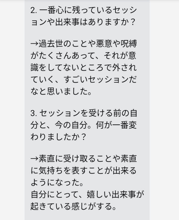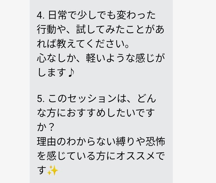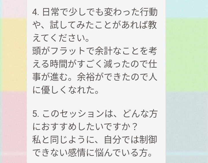 瞑想が苦手で誘導してもらってもなかなかイメージができずにいましたが、セッションを受けた後に行った瞑想ではスムーズにそのイメージができる感覚がありました。