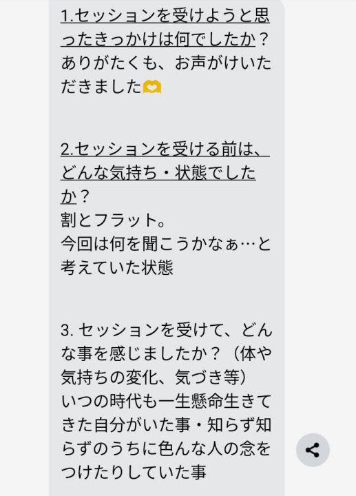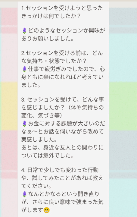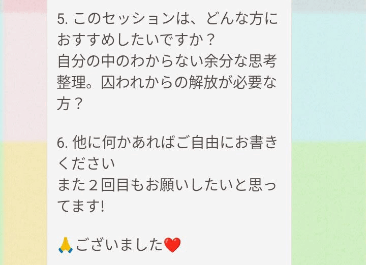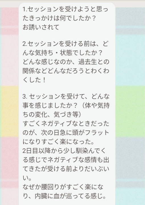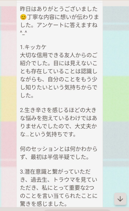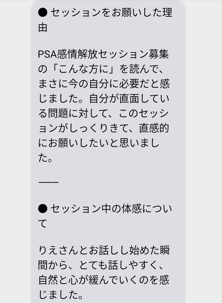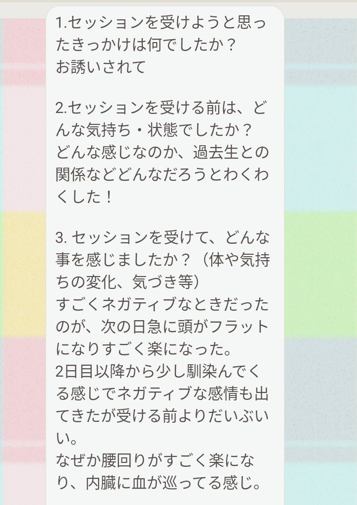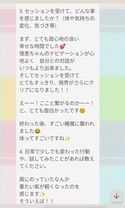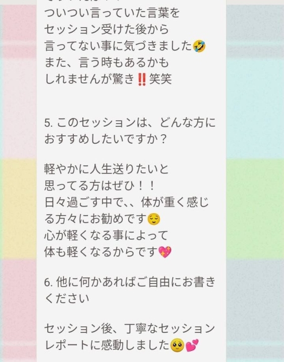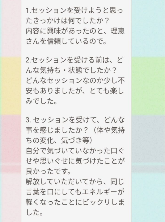 瞑想が苦手で誘導してもらってもなかなかイメージができずにいましたが、セッションを受けた後に行った瞑想ではスムーズにそのイメージができる感覚がありました。