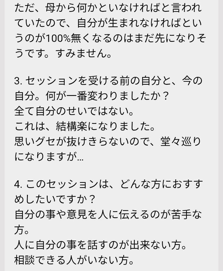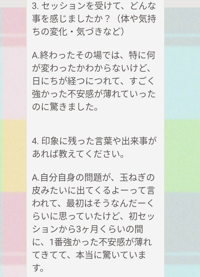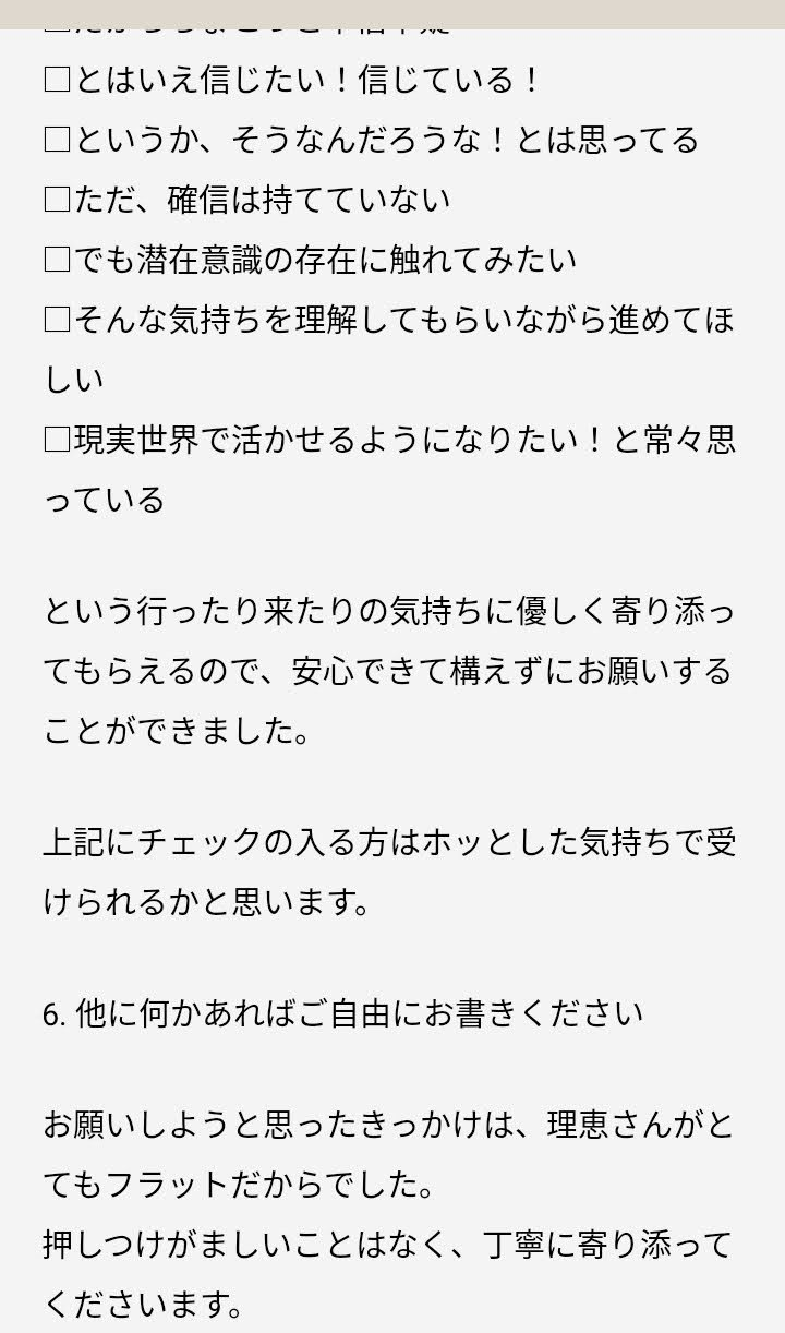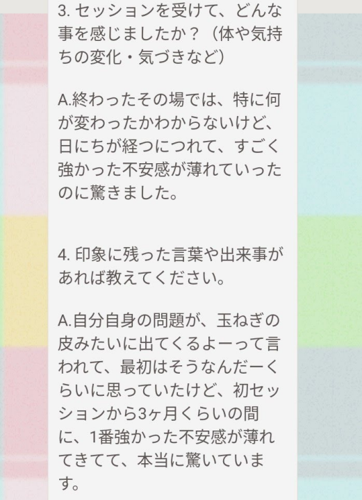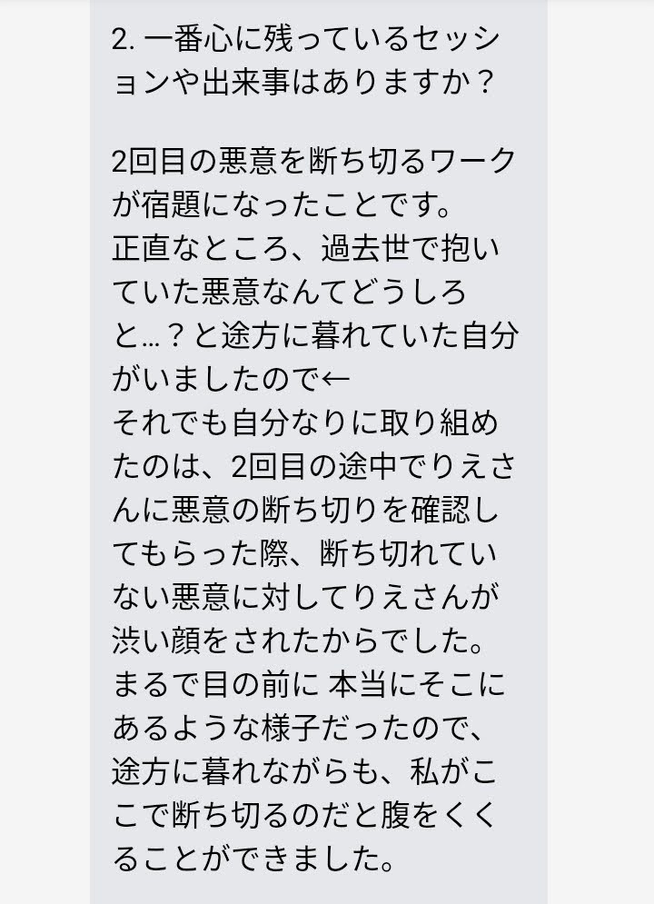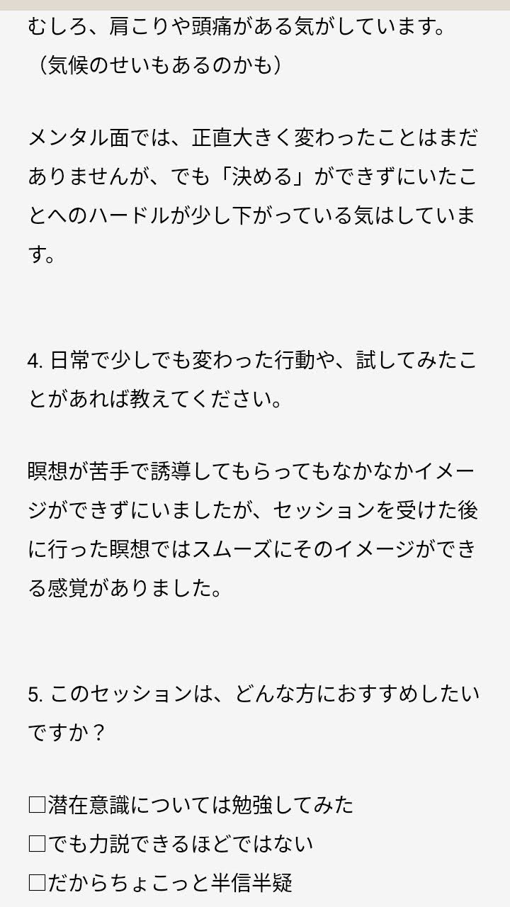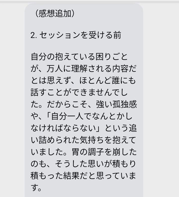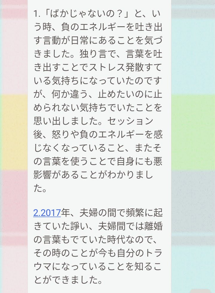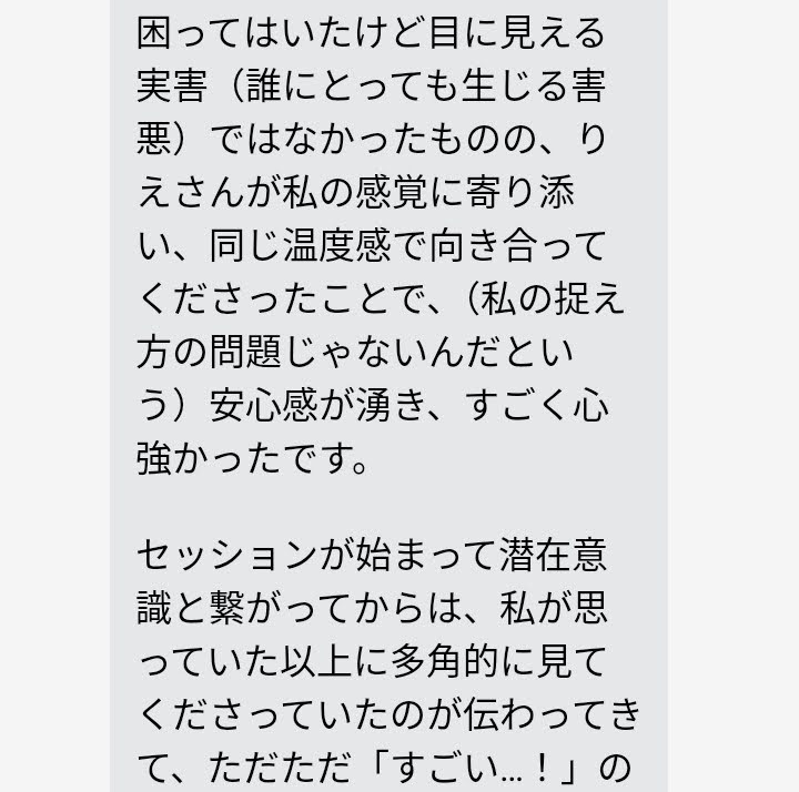 悩みに対しては、長いこと抱えてきていたので、これをきっかけに解決の糸口が掴めるかも?と、期待したいのと同時に、正直ものすごく信じきれていたわけではありませんでした。(長いこと抱えてきたことなので)